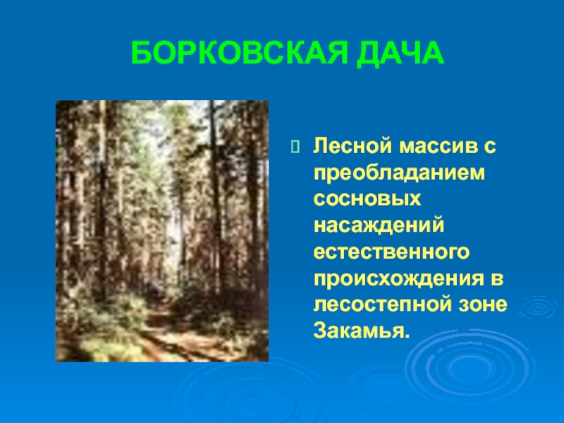 БОРКОВСКАЯ ДАЧАЛесной массив с преобладанием сосновых насаждений естественного происхождения в лесостепной зоне Закамья.