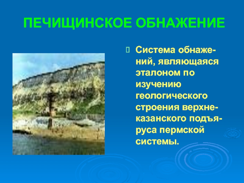 ПЕЧИЩИНСКОЕ ОБНАЖЕНИЕСистема обнаже-ний, являющаяся эталоном по изучению геологического строения верхне-казанского подъя-руса пермской системы.
