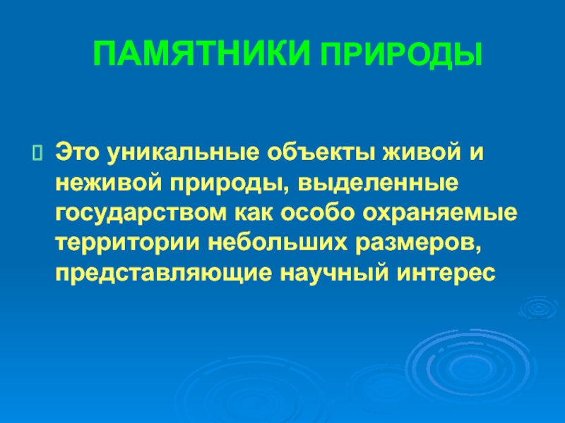 ПАМЯТНИКИ ПРИРОДЫЭто уникальные объекты живой и неживой природы, выделенные государством как особо охраняемые территории небольших размеров, представляющие научный интерес
