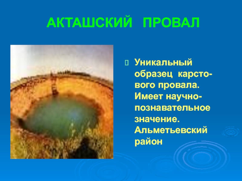 АКТАШСКИЙ  ПРОВАЛУникальный образец карсто-вого провала. Имеет научно-познавательное значение. Альметьевский район