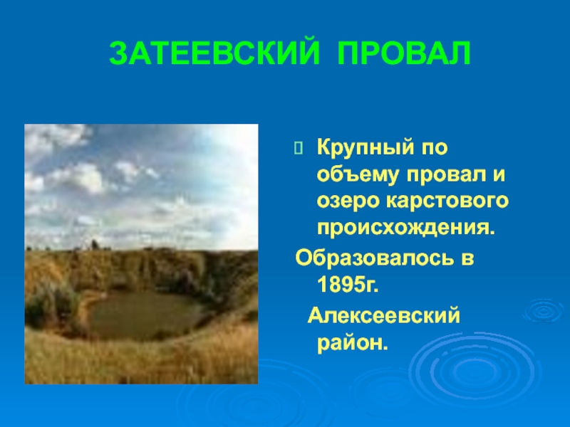 ЗАТЕЕВСКИЙ ПРОВАЛКрупный по объему провал и озеро карстового происхождения.Образовалось в 1895г.  Алексеевский район.