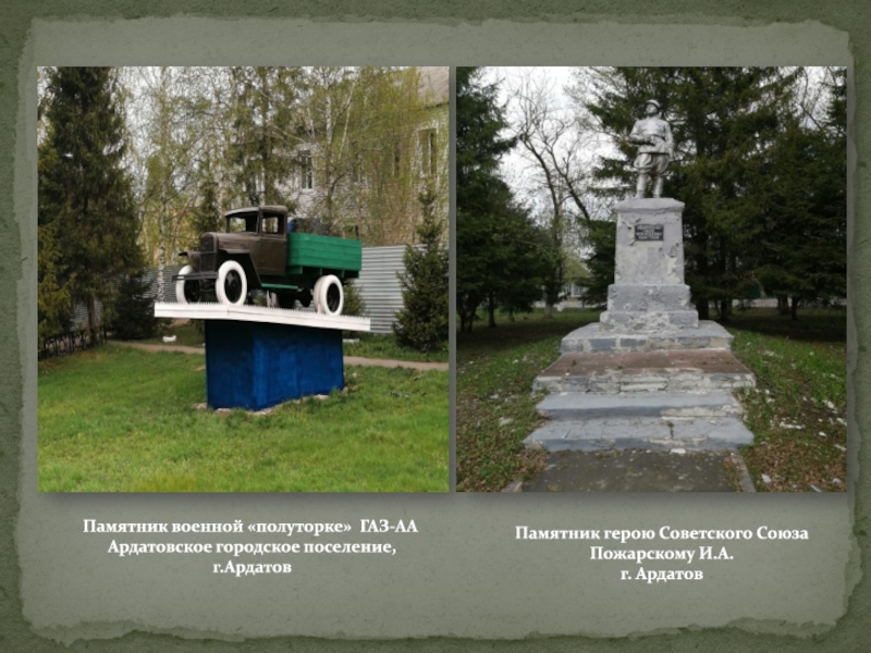 Памятник военной «полуторке» ГАЗ-АА Ардатовское городское поселение, г.АрдатовПамятник герою Советского Союза Пожарскому И.А.г. Ардатов