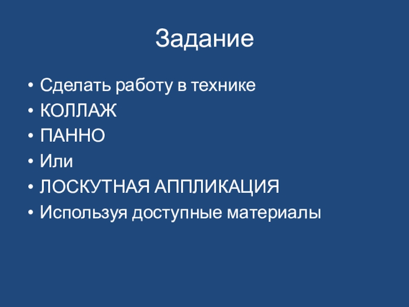 ЗаданиеСделать работу в технике КОЛЛАЖПАННОИлиЛОСКУТНАЯ АППЛИКАЦИЯИспользуя доступные материалы