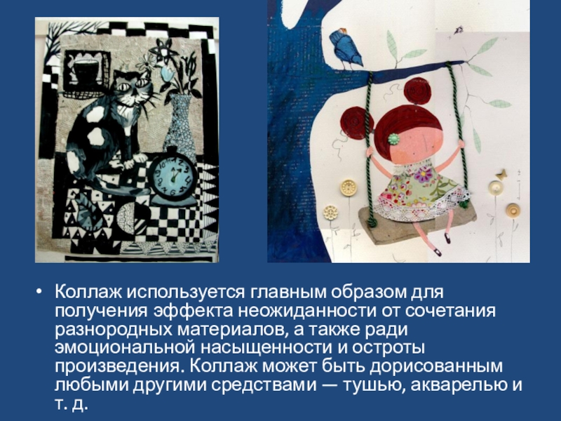 Слайд 7Коллаж используется главным образом для получения эффекта неожиданности от сочетания