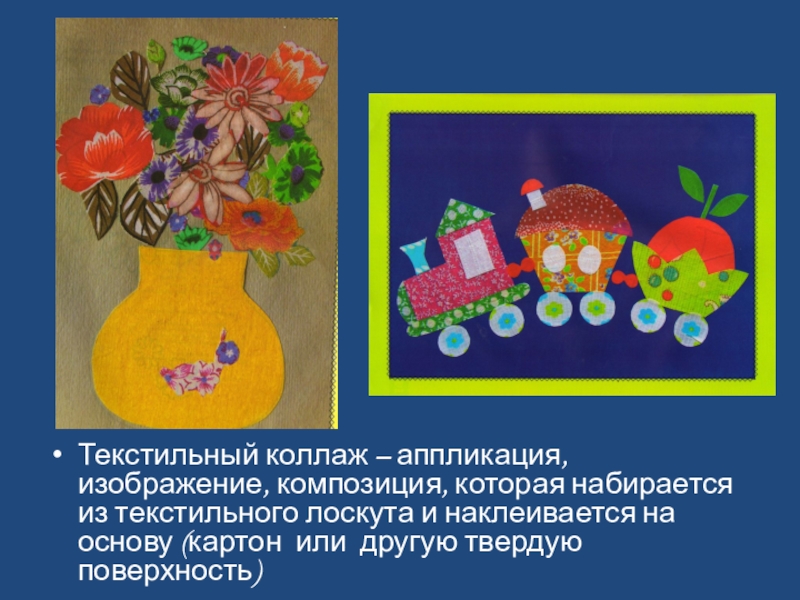 Слайд 12Текстильный коллаж – аппликация, изображение, композиция, которая набирается из текстильного