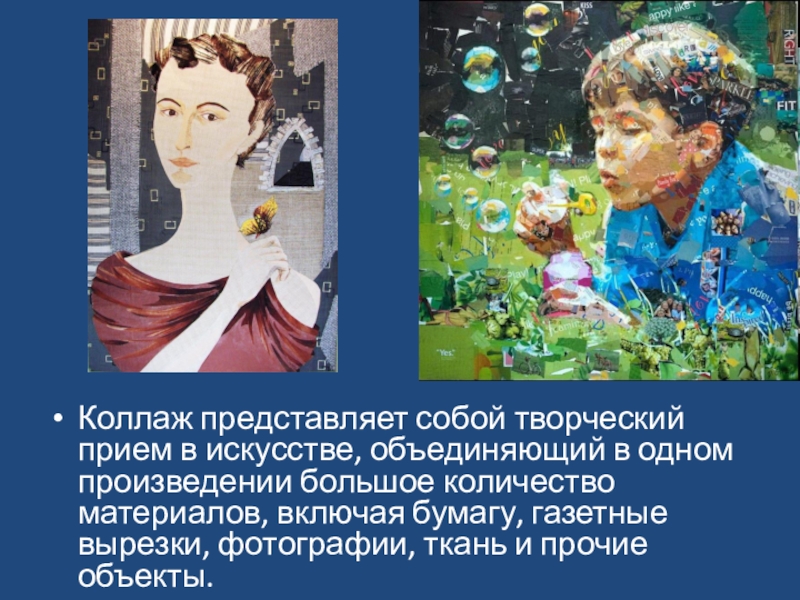 Слайд 3Коллаж представляет собой творческий прием в искусстве, объединяющий в одном