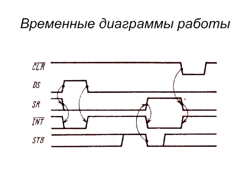 В состав микросхемы включен триггер запроса обслуживания SR (Service Request), отражающий состояние МБР. Триггер устанавливается в I по срезу сигнала STB. а в исходное состояние при высоком уровне внутреннего сигнала DS (рис.11.2.)Дополнительный элемент ИЛИ на выходе триггера обеспечивает переключение выхода INT только по срезам сигналов STB и DS, т. е. после завершения операций записи или считывания данных, что соответствует логике установки флажка готовности. Выход запроса 1NT выполнен по схеме с открытым коллектором. Внутренний регистр и триггер запроса могут быть установлены в исходное состояние при подаче напряжения низкого уровня на вход CLR (Clear).