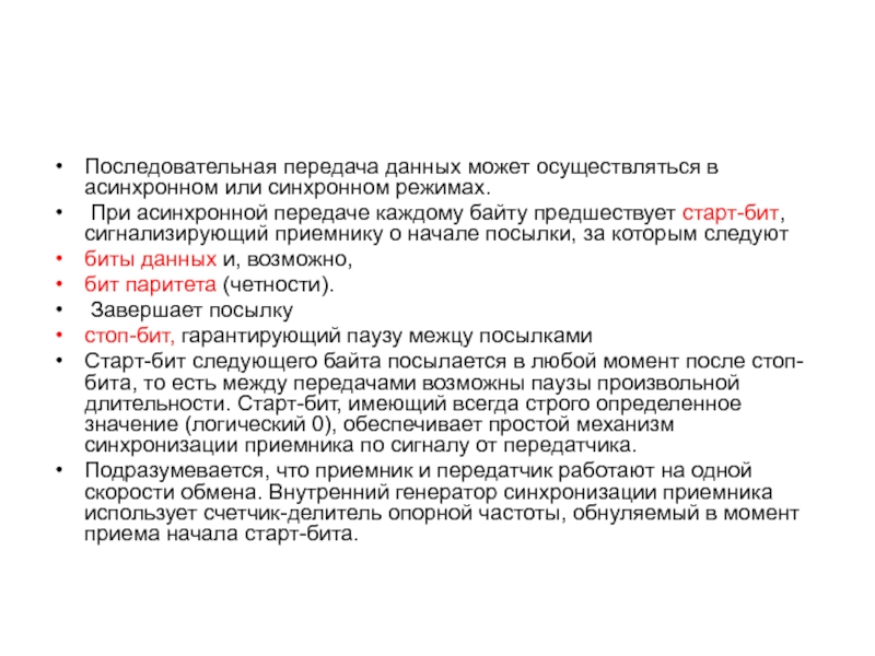 Последовательная передача данных может осуществляться в асинхронном или синхронном режимах.