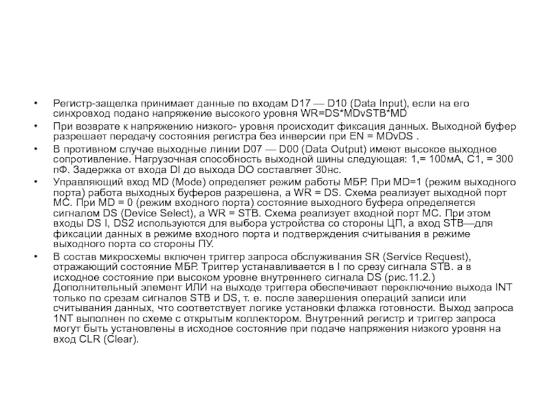 Управляющий вход MD (Mode) определяет режим работы МБР. При MD=1 (режим выходного порта) работа выходных буферов разрешена, a WR = DS. Схема реализует выходной порт МС. При MD = 0 (режим входного порта) состояние выходного буфера определяется сигналом DS (Device Select), a WR = STB. Схема реализует входной порт МС. При этом входы DS I, DS2 используются для выбора устройства со стороны ЦП, а вход STB—для фиксации данных в режиме входного порта и подтверждения считывания в режиме выходного порта со стороны ПУ.