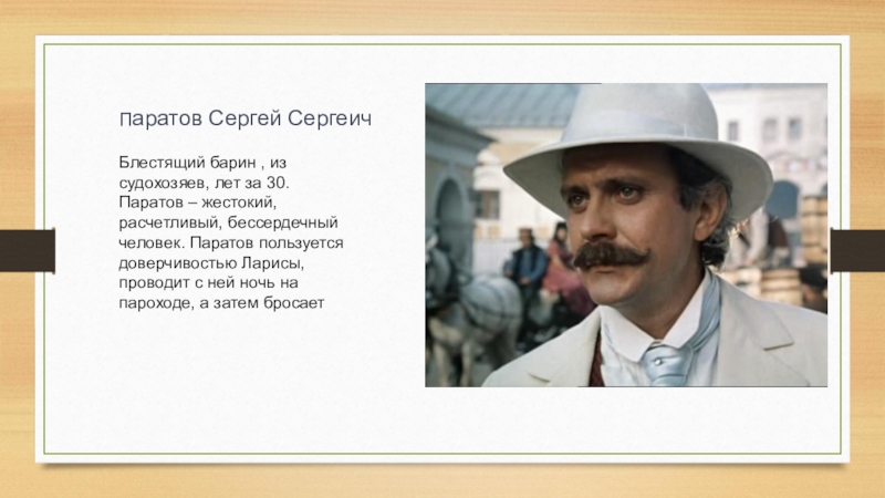Вожеватов неравнодушно относится к главной героине Ларисе, однако он не знает, что такое любовь.