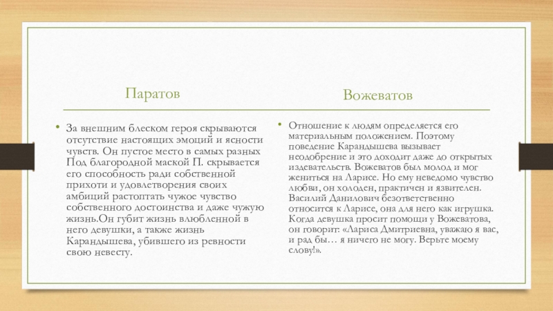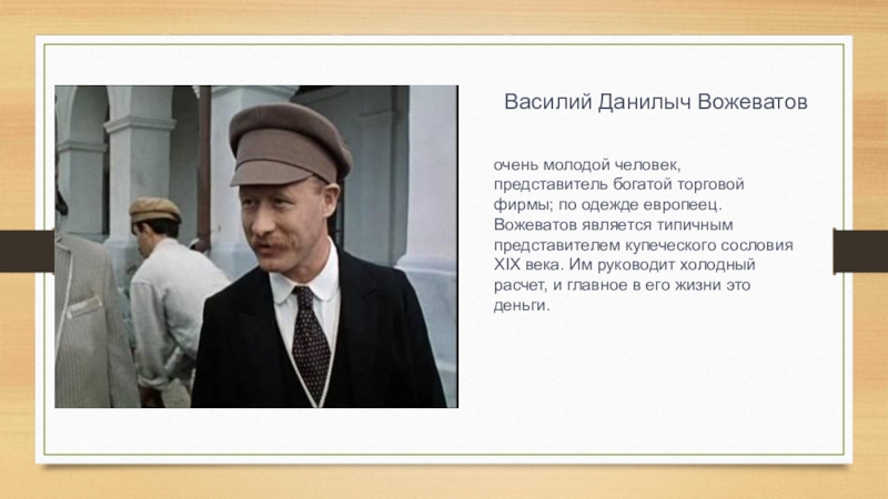 Отношение к людям определяется его материальным положением. Поэтому поведение Карандышева вызывает неодобрение и это доходит даже до открытых издевательств. Вожеватов был молод и мог жениться на Ларисе. Но ему неведомо чувство любви, он холоден, практичен и язвителен. Василий Данилович безответственно относится к Ларисе, она для него как игрушка. Когда девушка просит помощи у Вожеватова, он говорит: «Лариса Дмитриевна, уважаю я вас, и рад бы… я ничего не могу. Верьте моему слову!».