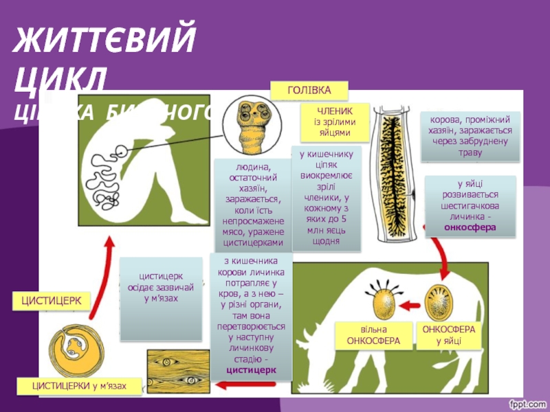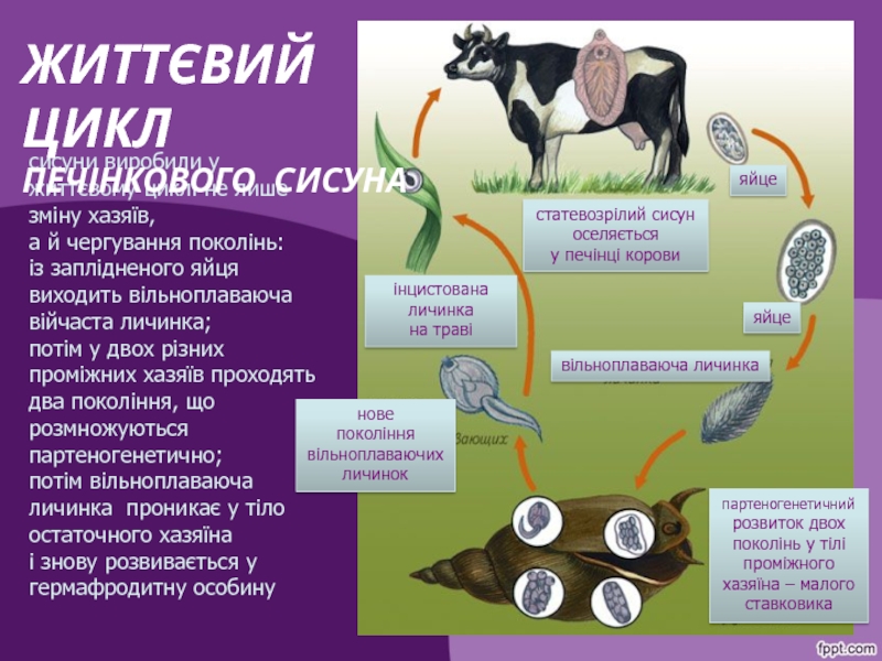 корова, проміжний хазяїн, заражається через забруднену траву