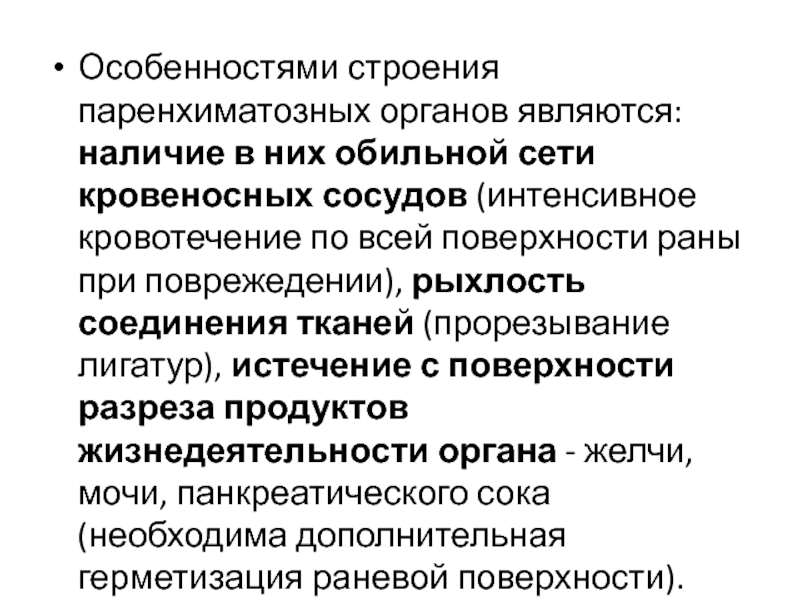 рыхлость соединения тканей (прорезывание лигатур), истечение с поверхности разреза продуктов жизнедеятельности органа - желчи, мочи, панкреатического сока (необходима дополнительная герметизация раневой поверхности).