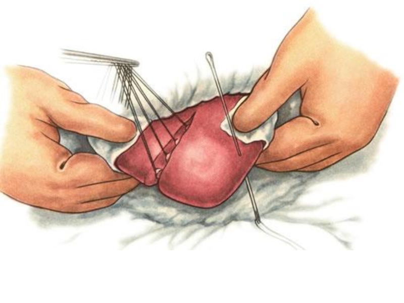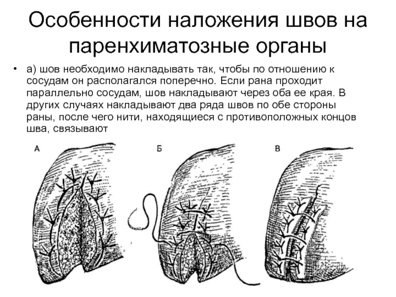Слайд 7Особенности наложения швов на паренхиматозные органы