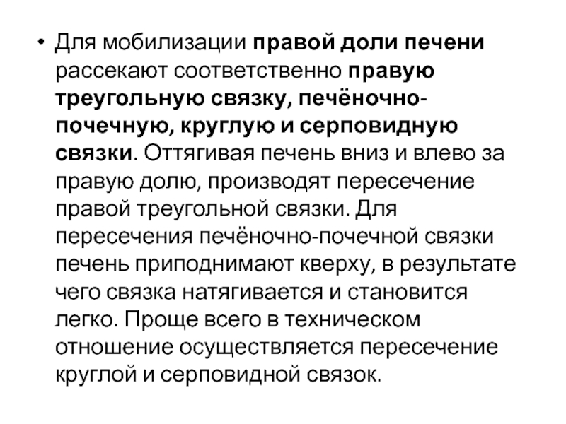 Слайд 21Для мобилизации правой доли печени рассекают соответственно правую треугольную связку,