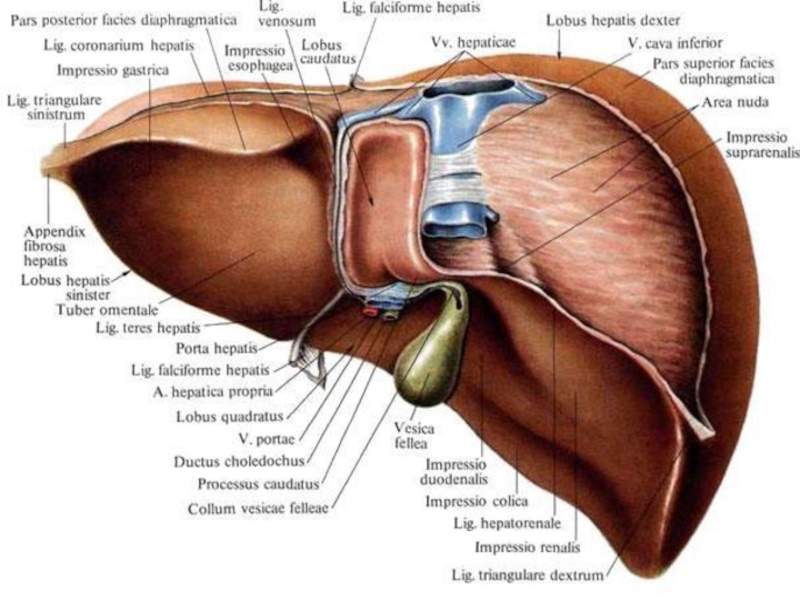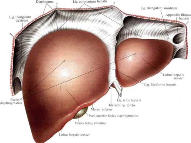 печёночно-почечную, круглую и серповидную связки. Оттягивая печень вниз и влево