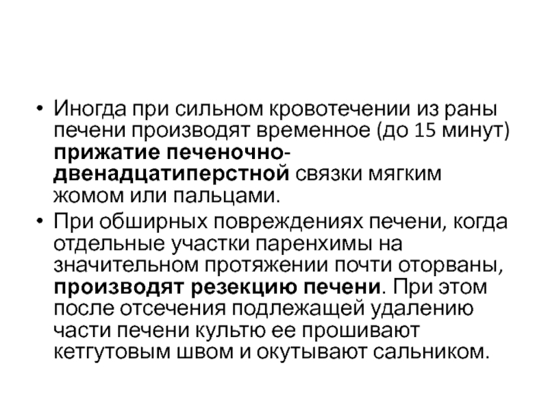 Слайд 17Иногда при сильном кровотечении из раны печени производят временное (до