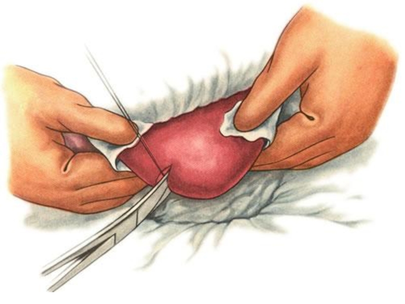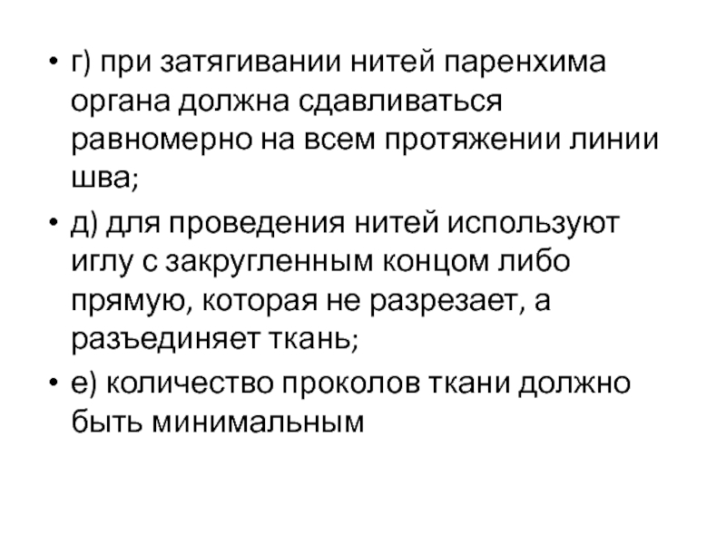 Слайд 9г) при затягивании нитей паренхима органа должна сдавливаться равномерно на