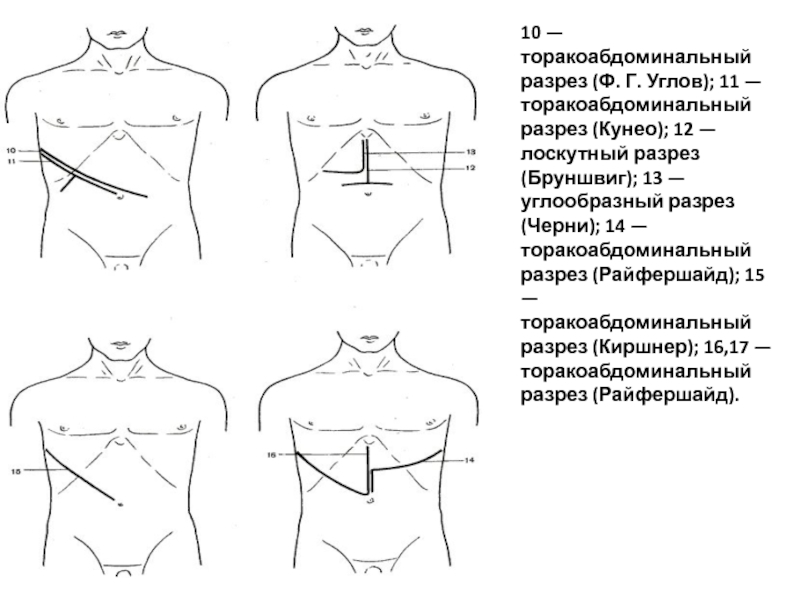 разрез (Черни); 14 — торакоабдоминальный разрез (Райфершайд); 15 — торакоабдоминальный разрез (Киршнер); 16,17 — торакоабдоминальный разрез (Райфершайд).