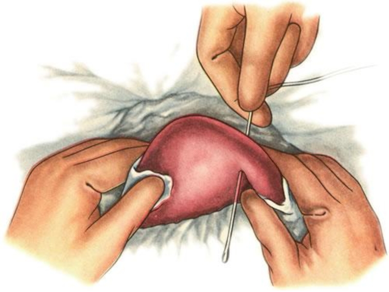 Вначале тупой иглой прошивают край печени и нить завязывают.