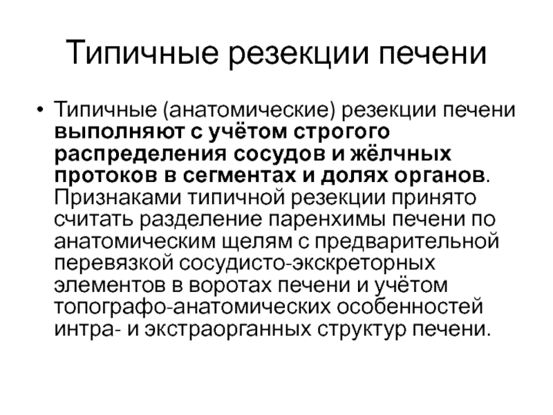 Признаками типичной резекции принято считать разделение паренхимы печени по анатомическим щелям с предварительной перевязкой сосудисто-экскреторных элементов в воротах печени и учётом топографо-анатомических особенностей интра- и экстраорганных структур печени.