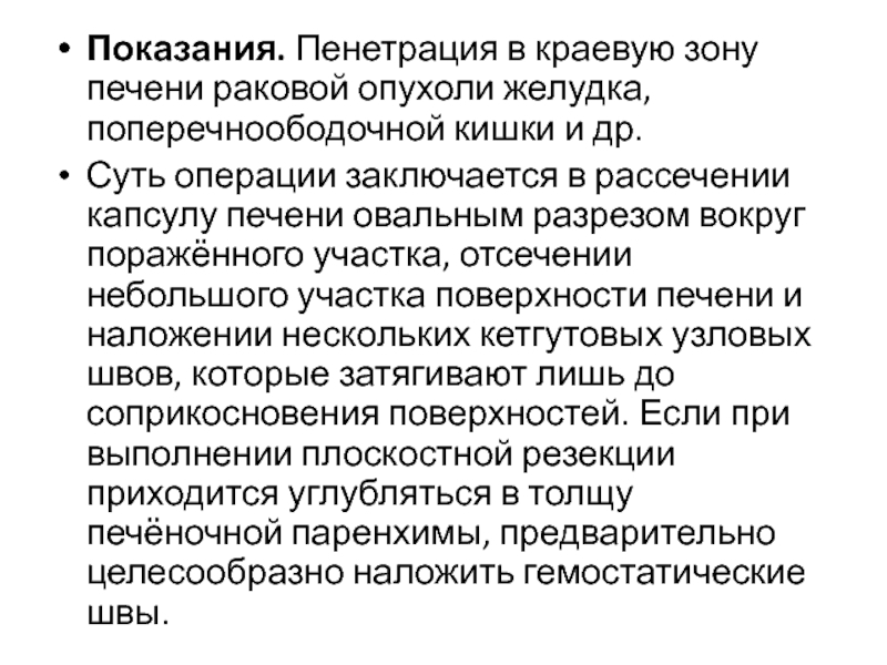 Слайд 36Показания. Пенетрация в краевую зону печени раковой опухоли желудка, поперечноободочной