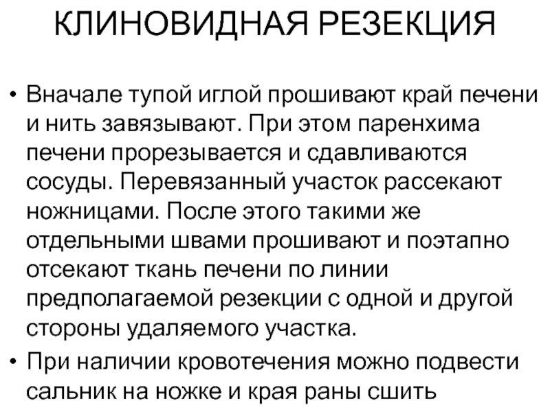 овальным разрезом вокруг поражённого участка, отсечении небольшого участка поверхности печени и наложении нескольких кетгутовых узловых швов, которые затягивают лишь до соприкосновения поверхностей. Если при выполнении плоскостной резекции приходится углубляться в толщу печёночной паренхимы, предварительно целесообразно наложить гемостатические швы.