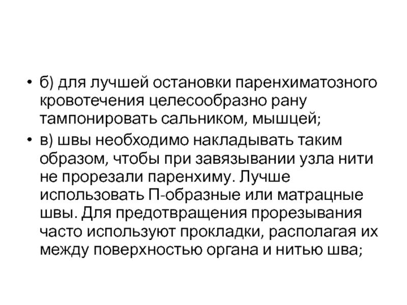 Слайд 8б) для лучшей остановки паренхиматозного кровотечения целесообразно рану тампонировать сальником,
