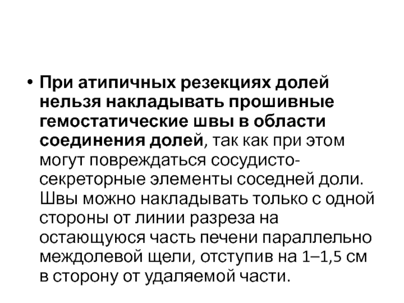 Слайд 25При атипичных резекциях долей нельзя накладывать прошивные гемостатические швы в