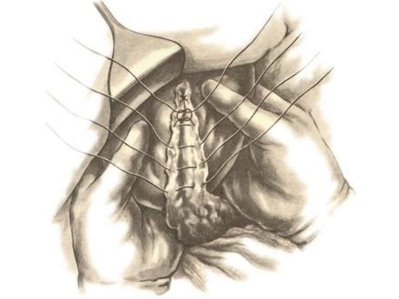 Шов Джиардано прошивает паренхиму печени отдельными двойными нитями. После рассечения нитей концы их связывают на верхней и нижней поверхностях печени.