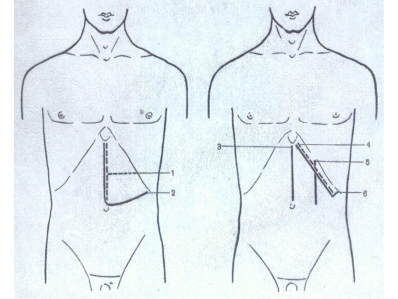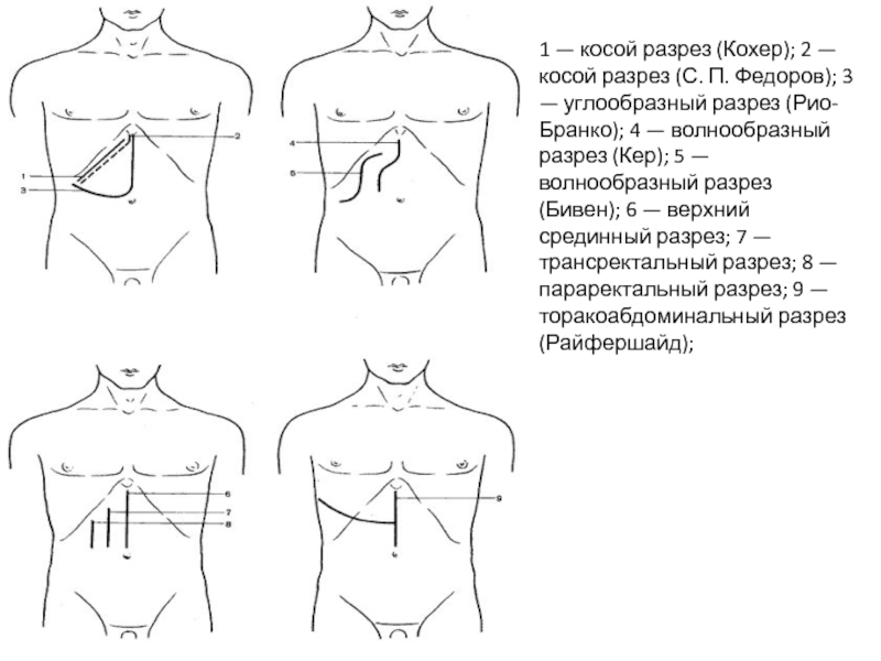 разрез (Кер); 5 — волнообразный разрез (Бивен); 6 — верхний срединный разрез; 7 — трансректальный разрез; 8 — параректальный разрез; 9 — торакоабдоминальный разрез (Райфершайд);