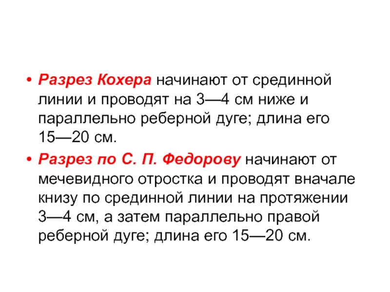 по С. П. Федорову начинают от мечевидного отростка и проводят вначале книзу по срединной линии на протяжении 3—4 см, а затем параллельно правой реберной дуге; длина его 15—20 см.
