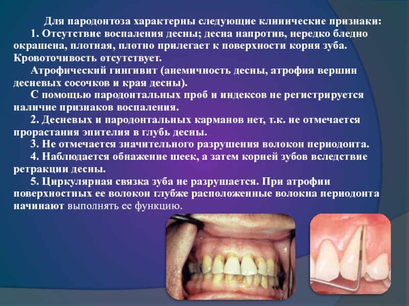 Слайд 24Для пародонтоза характерны следующие клинические признаки: