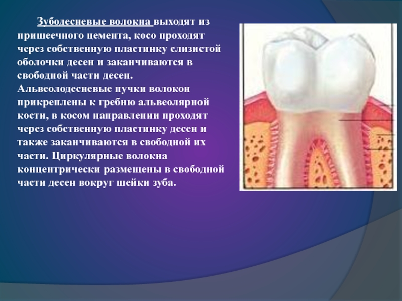 Слайд 11 Зубодесневые волокна выходят из пришеечного цемента, косо проходят через