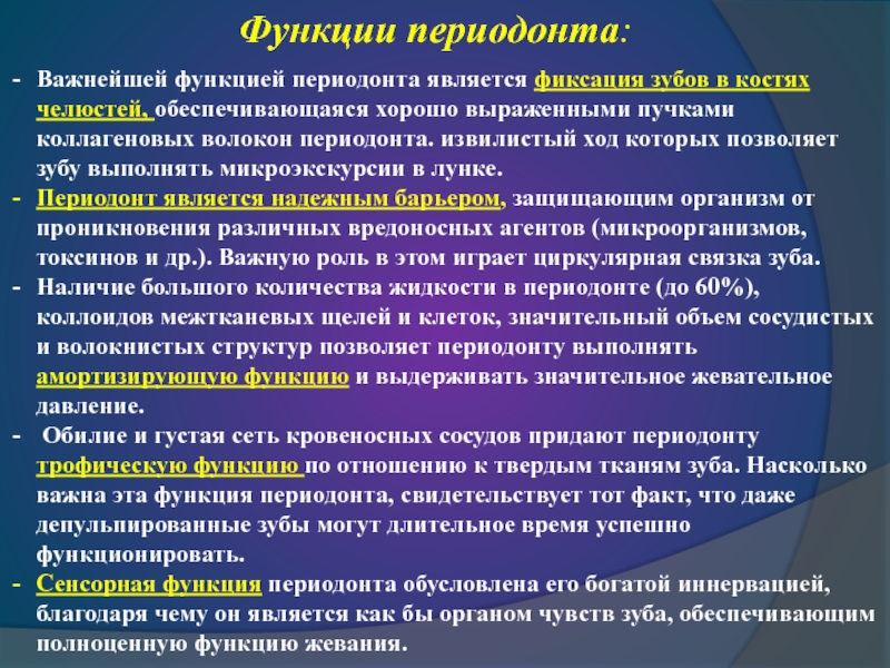 Важнейшей функцией периодонта является фиксация зубов в костях челюстей,