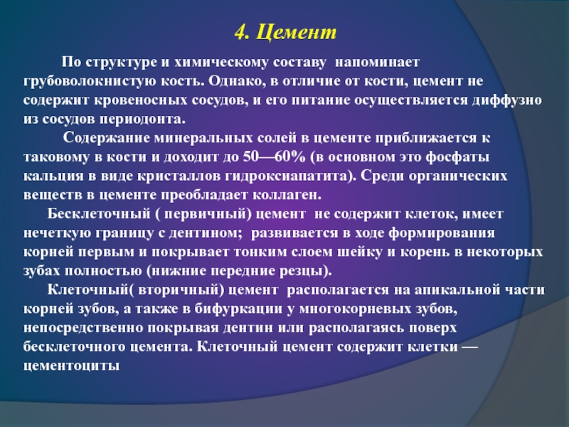 кость. Однако, в отличие от кости, цемент не содержит кровеносных