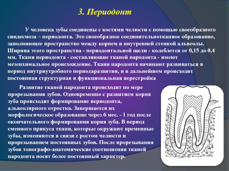 своеобразное соединительнотканное образование, заполняющее пространство между корнем и внутренней стенкой альвеолы. Ширина этого пространства - периодонтальной щели - колеблется от 0,15 до 0,4 мм. Ткани периодонта - составляющие тканей пародонта - имеют мезенхимальное происхождение. Ткани пародонта начинают развиваться в период внутриутробного периодаразвития, и в дальнейшем происходит постоянная структурная и функциональная перестройка