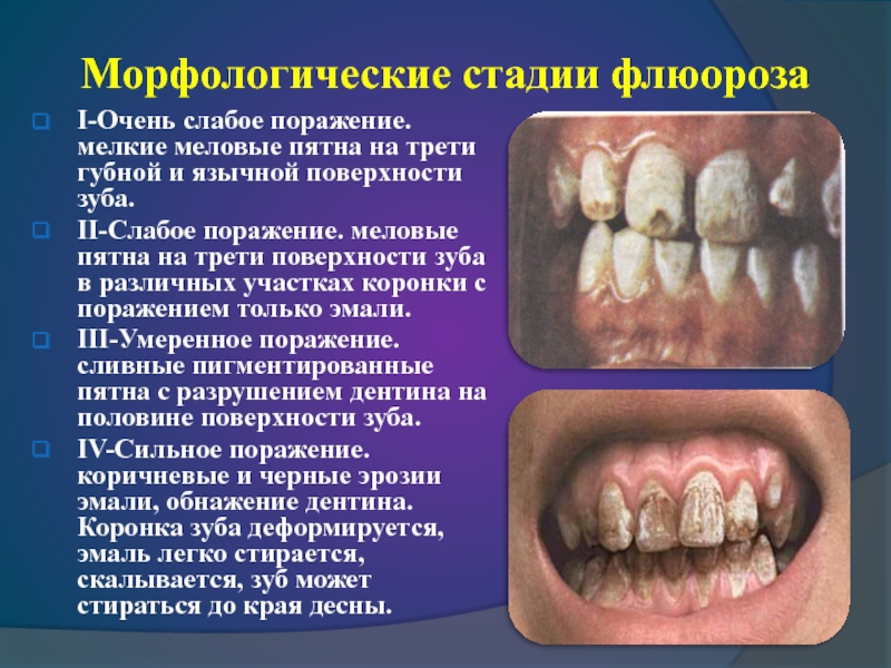 IV-Сильное поражение. коричневые и черные эрозии эмали, обнажение дентина. Коронка зуба деформируется, эмаль легко стирается, скалывается, зуб может стираться до края десны.