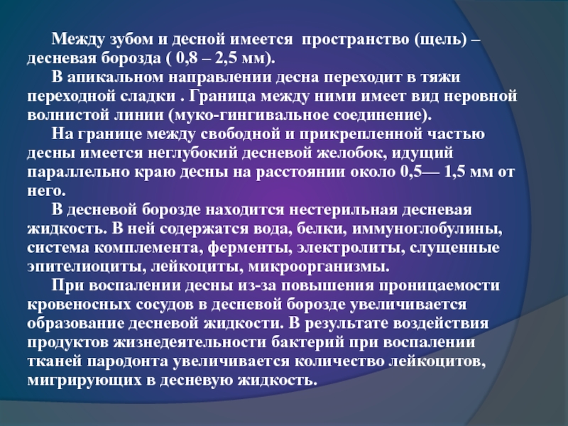 Слайд 4Между зубом и десной имеется пространство (щель) – десневая борозда