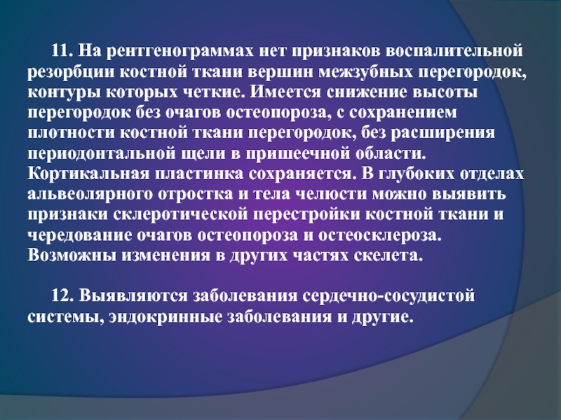 11. На рентгенограммах нет признаков воспалительной резорбции костной ткани вершин