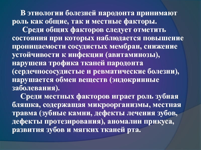 Слайд 28В этиологии болезней пародонта принимают роль как общие, так и