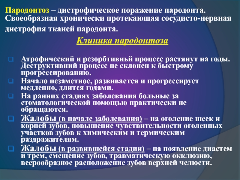Слайд 23Пародонтоз – дистрофическое поражение пародонта. Своеобразная хронически протекающая сосудисто-нервная дистрофия