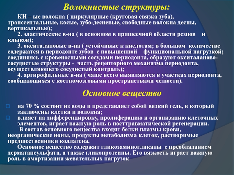 3. окситалановые в-на ( устойчивые к кислотам; в большом количестве содержатся в периодонте зубов с повышенной функциональной нагрузкой; соединяясь с кровеносными сосудами периодонта, образуют окситаланово-сосудистые структуры - часть рецепторного механизма периодонта, осуществляющего сосудистый контроль);