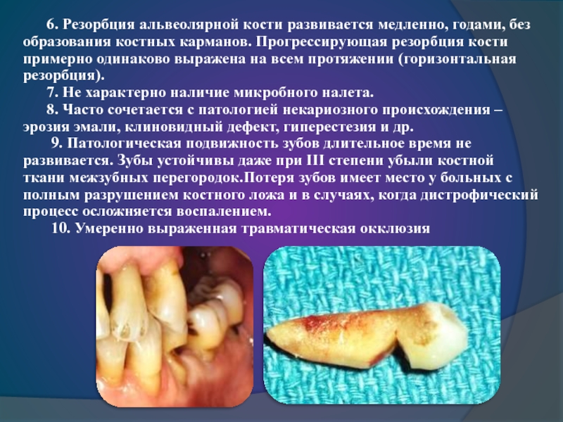 9. Патологическая подвижность зубов длительное время не развивается. Зубы устойчивы даже при III степени убыли костной ткани межзубных перегородок.Потеря зубов имеет место у больных с полным разрушением костного ложа и в случаях, когда дистрофический процесс осложняется воспалением.