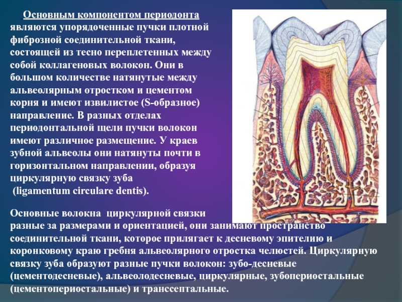 Слайд 10 Основным компонентом периодонта являются упорядоченные пучки плотной