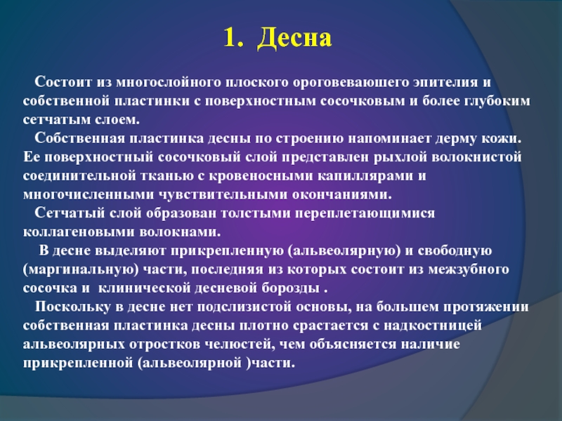 Собственная пластинка десны по строению напоминает дерму кожи. Ее поверхностный сосочковый слой представлен рыхлой волокнистой соединительной тканью с кровеносными капиллярами и многочисленными чувствительными окончаниями.