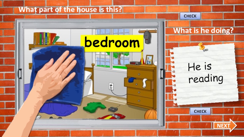 bedroomWhat part of the house is this?NEXTCHECKWhat is he doing?He is readingCHECK
