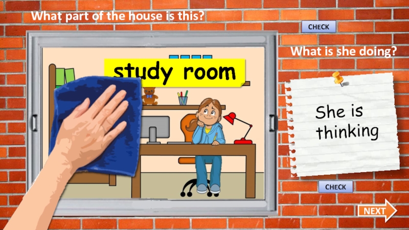 study roomWhat part of the house is this?NEXTCHECKWhat is she doing?She is thinkingCHECK