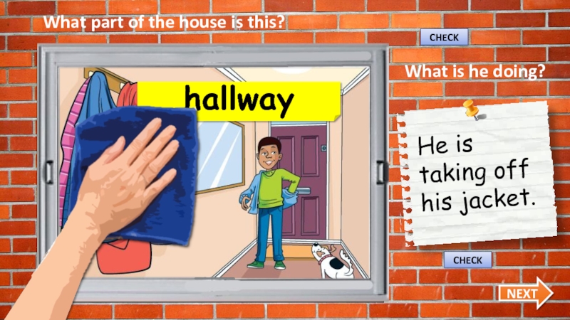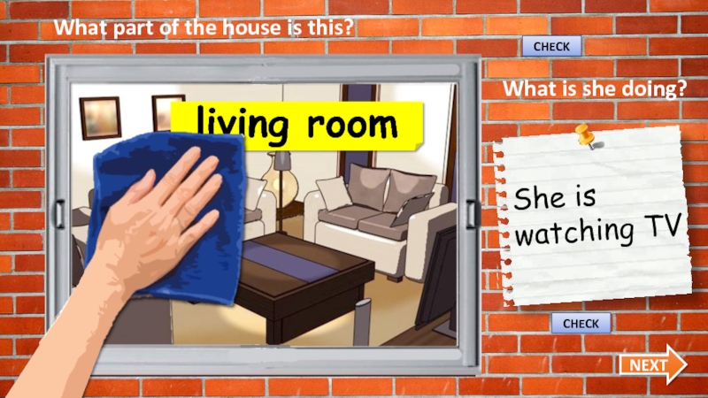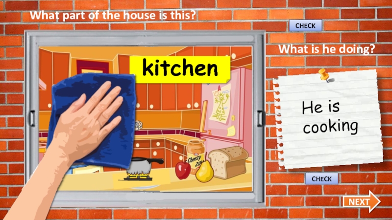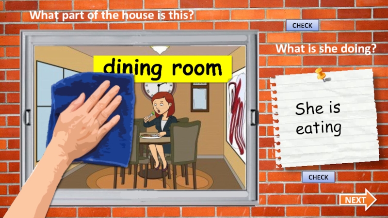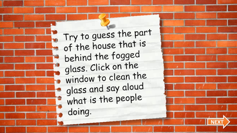 NEXTTry to guess the part of the house that is behind the fogged glass. Click on the window to clean the glass and say aloud what is the people doing.