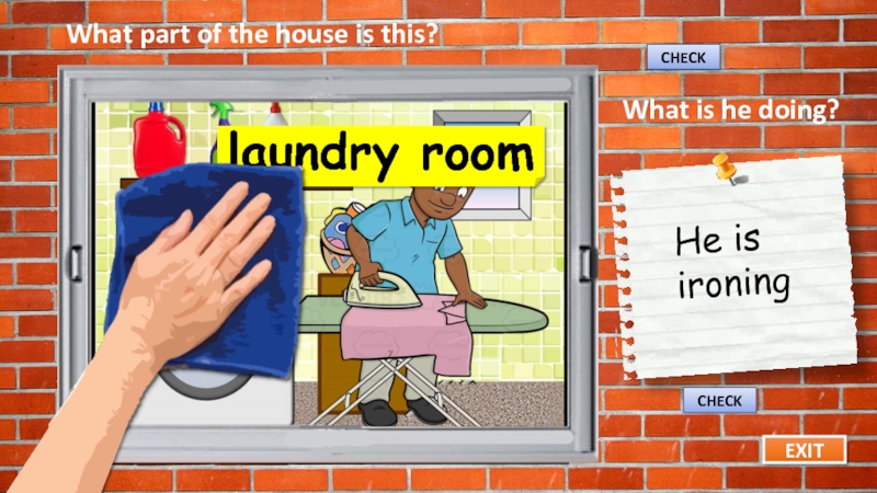 laundry roomWhat part of the house is this?CHECKWhat is he doing?He is ironingCHECKEXIT
